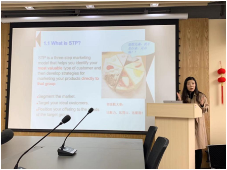 同样来自广告系的陈薇老师带着自己的双语课程《市场营销学》第三位上场。课程开头,她用一口流利的英语介绍了本次课程的要点。陈薇老师风格稳重,她重点介绍了STP(市场细分战略),并列举了宝洁家族的案例进行阐释;还展示了英文市场营销术语,充分体现双语课程的特色。