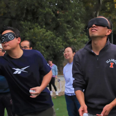 导师和员工两两配对分为5组,其中一人蒙住眼睛投篮,另外一人腰里系一纸篓,站在3米线外,负责接住队友投出的球2在两分钟时间里,接到球多者获胜。