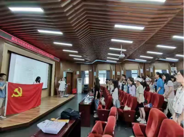 在领誓人邵恒媛宣读了参加宣誓的新党员名单后,25名预备党员举起右拳,铿锵有力地集体宣誓,庄严地表达自己的信仰,愿为共产主义奋斗终生,在场的入党积极分子对党旗行注目礼。随后,新党员们集体学唱了《国际歌》,仪式结束后,学院组织集体开展党史学习教育“红色文物青年说”专题学习。